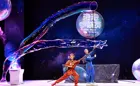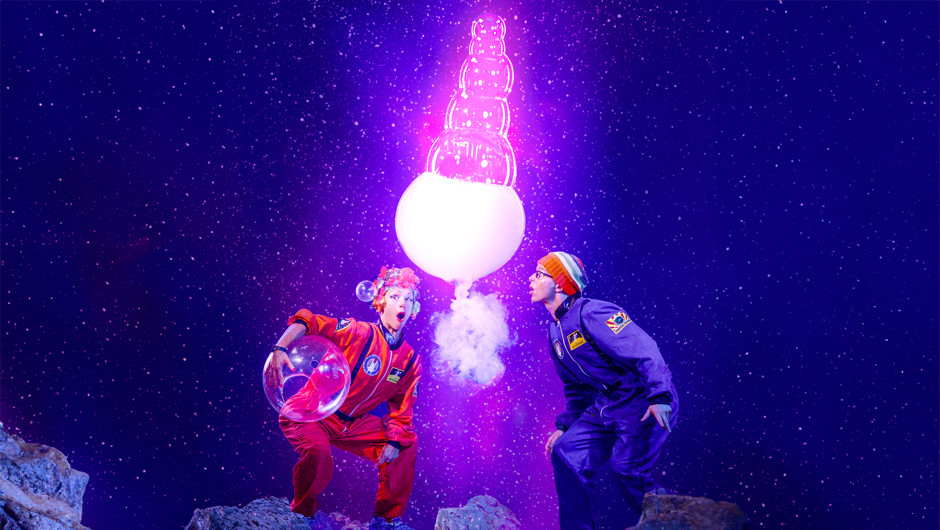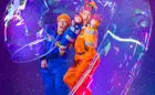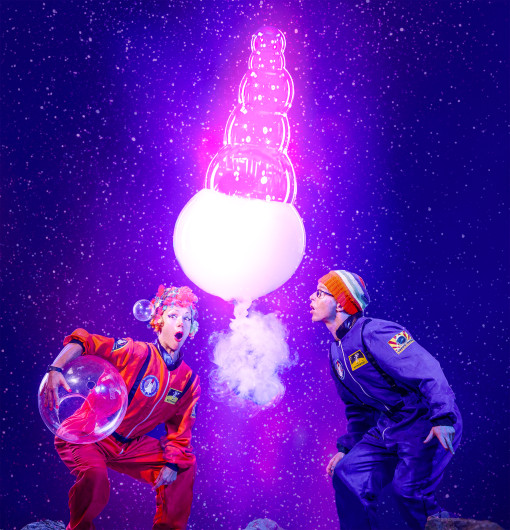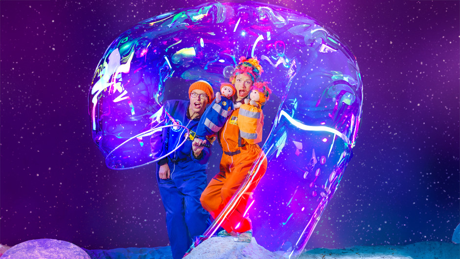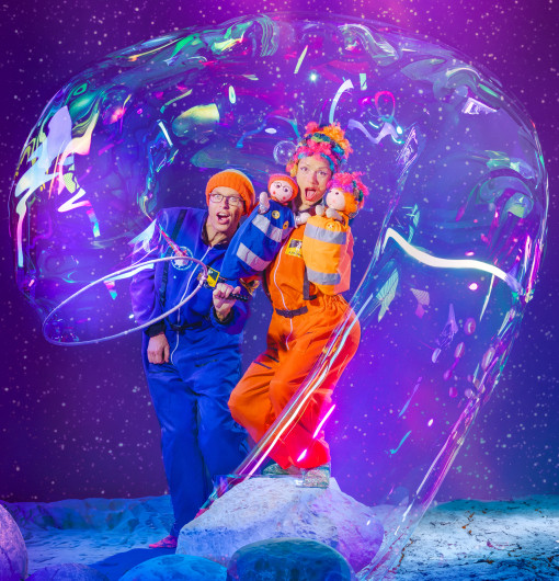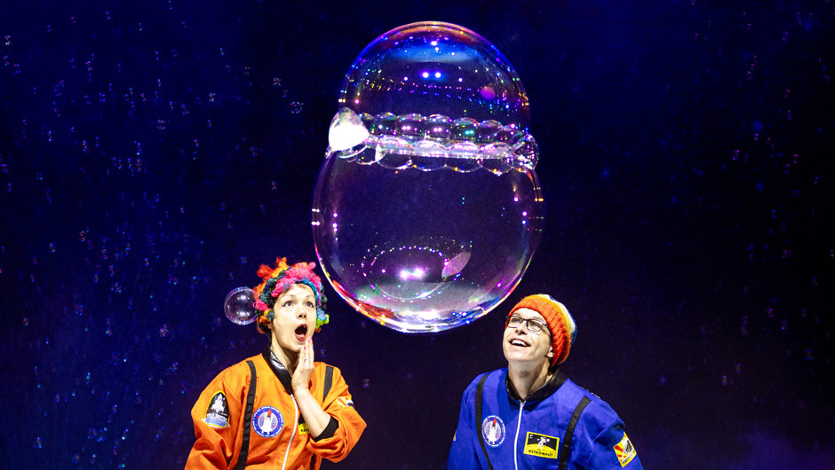 See flying bubble rockets that launches 10 metres into the air, clear bubbles filled with smoke, bubbles that join into each other and separate, shadow bubble puppetry, fire bubbles, a bubble fire tornado, square bubbles, giant bubble screens that shimmer, children inside bubbles, spinning carousels, giant bubble tubes that arch through the sky and bubbles so big that several people could fit inside! The show finishes in a million bubble party that fills the room in a celebration of bubbles.