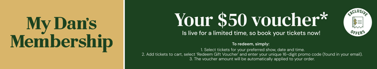 *Offer valid from 10am AEDT 27/03/2026 - 10am AEDT 03/04/2026, while gift stocks last. VIC 18+ who are My Dan’s members & have received an eDM invite with a unique promo code only. Promo code not transferable. To claim a gift, the claimant must complete the following steps during the Promotional Period: (a) click on the direct link sent to them via eDM to be routed to the Promotional claim page (https://www.comedyfestival.com.au/dan-murphys/); and follow the prompts to the Promotion claim page; and fully complete and submit the online claim form ticket redemption process by selecting their preferred Melbourne International Comedy Festival: 2026 Festival show, date and time (from options provided) and entering their unique promo code (found within Promotional email) into the ‘Redeem Gift Voucher’ text field on the ‘Your Cart’ page. Where the ticket price exceeds the voucher amount, you must pay the balance of the purchase with an alternative payment method. All transactions through the Melbourne International Comedy Festival website are subject to the full Terms and Conditions and no refunds or exchanges will be offered except in accordance with consumer law. To purchase tickets customers must create an account with the Melbourne International Comedy Festival, and agree to the Festival’s Terms of Service and Privacy Policy. T&Cs apply.